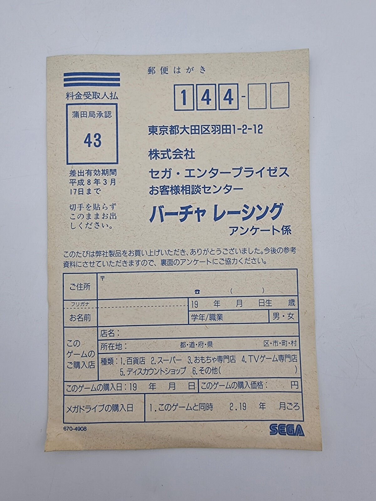 VIRTUA RACING SEGA MEGADRIVE JAPAN USED